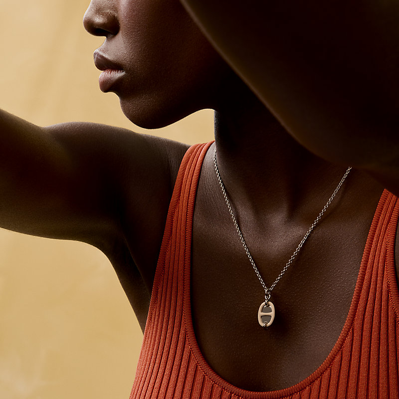 金属坠饰。Mini Maillon系列撷取标志性Chaine d'Ancre锁扣,呼应爱马仕航海风格。适合日常佩戴的珠宝,备有丰富的颜色款式可供选择,可单独佩戴或叠戴。借助调节圆环,可调整项链长度。