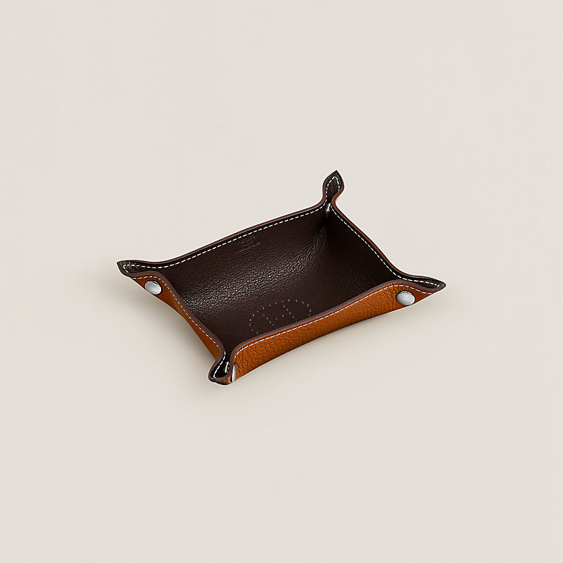 Mises et Relances Desk办公系列的灵感源于爱马仕经典置物盘,本季以光滑南瓜黄和浅黄褐色H小公牛皮双色款式重新回归。作品中央的经典H Evelyne图案采用镂孔工艺制成。