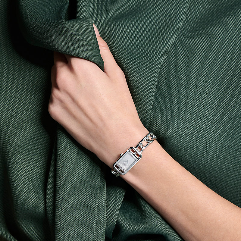 小号,29毫米 表耳间距:29毫米 表盘宽度:17毫米 镶钻不锈钢表壳,镶嵌“自由散落状锚链”,镶嵌55颗钻石(0.21克拉) 防眩光蓝宝石水晶表镜 镀铑喷砂镶钻表盘,镶嵌35颗钻石(0.09克拉) 石英机芯,瑞士制造 时、分指示功能 防水深度达3巴。 不锈钢单圈表链