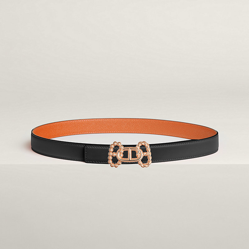 金属皮带扣。这款皮带扣演绎爱马仕标志性Chaine d'Ancre图案的三重交织。通过相互交错的结构,巧妙营造出“H”字母造型,同时增添动感风格。金属质感: 镀玫瑰金 & Swift和Epsom小牛皮双面皮腰带。