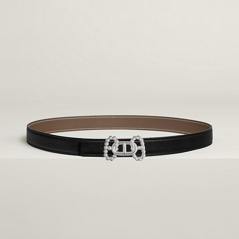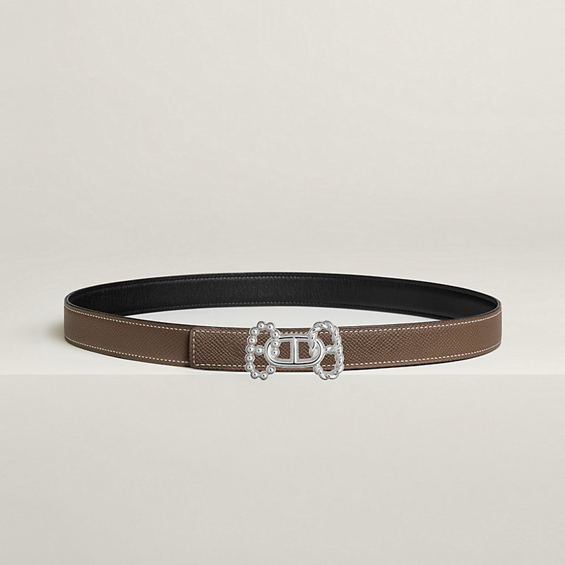 金属皮带扣。这款皮带扣演绎爱马仕标志性Chaine d'Ancre图案的三重交织。通过相互交错的结构,巧妙营造出“H”字母造型,同时增添动感风格。 & Swift和Epsom小牛皮双面皮腰带。