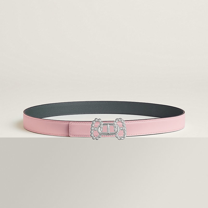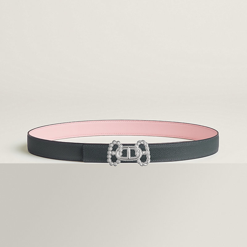 金属皮带扣。这款皮带扣演绎爱马仕标志性Chaine d'Ancre图案的三重交织。通过相互交错的结构,巧妙营造出“H”字母造型,同时增添动感风格。金属质感: 镀钯 & Swift和Epsom小牛皮双面皮腰带。