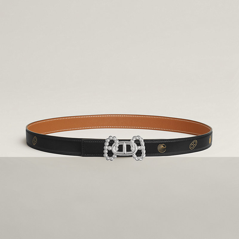金属皮带扣。这款皮带扣演绎爱马仕标志性Chaine d'Ancre图案的三重交织。通过相互交错的结构,巧妙营造出“H”字母造型,同时增添动感风格。 & 印花Swift和Epsom小牛皮双面皮腰带。皮带全长皆烫印金箔,并交替点缀贝壳元素和Chaine d'Ancre链节设计。