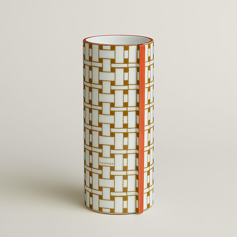 Perimetre花瓶饰有吉安帕奥罗·帕尼(Gianpaolo Pagni)设计的“Abaca H”图案。这款陶瓷作品具有凸起的棱线,酷似一张经折叠并打褶的皮革。明快的线条和手工装饰的利落边缘令人联想起抛光皮革,成为系列的独特印记。此图案的灵感源自从菲律宾本土香蕉树中提取的植物纤维——蕉麻,呈现植物特有的织纹。“Abaca H”图案备有鼠尾草绿和青铜色两种颜色可供选择,花瓶侧缘点缀手绘饰边。