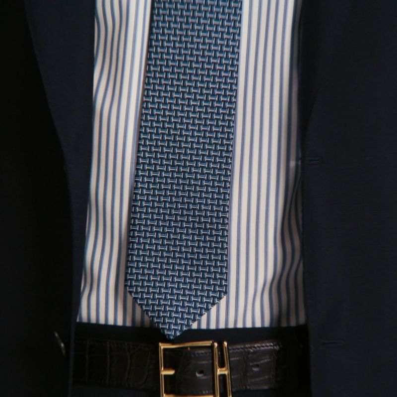 为令您的领带保持亮丽美感,请将其解开,展平收纳。请避免接触雨水或化学物质。必要时可进行专业干洗。