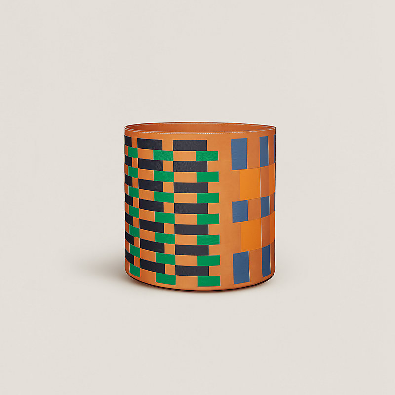 手工编织天然色牛皮和Epsom小牛皮杂志收纳篮。