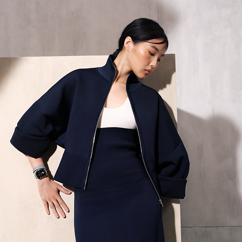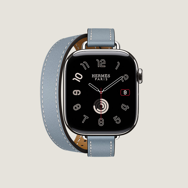 Apple Watch Hermès Series 11 42毫米钛金属表盘。 & 亚麻蓝Swift小牛皮双圈表带,饰有天然色缝线。