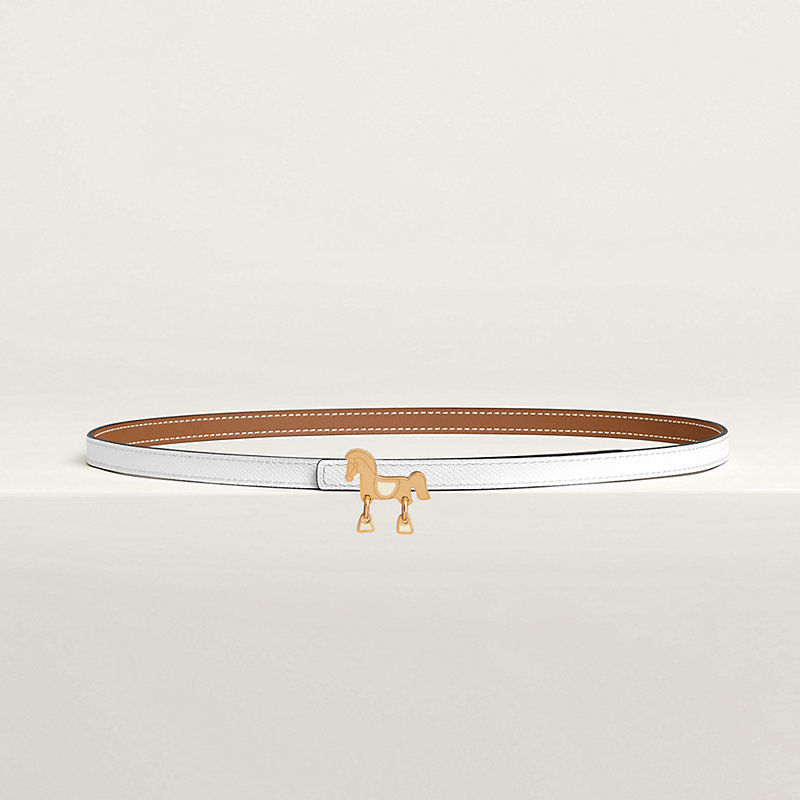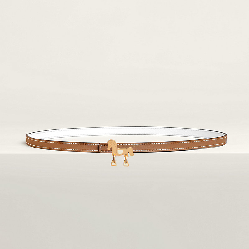 漆艺金属皮带扣。这款吊饰皮带扣采用机械加工和激光雕刻技术打造,饰有漆艺细节,呈现生动逼真的挽具、马鞍和马蹄造型。 & Swift和Epsom小牛皮双面皮腰带。
