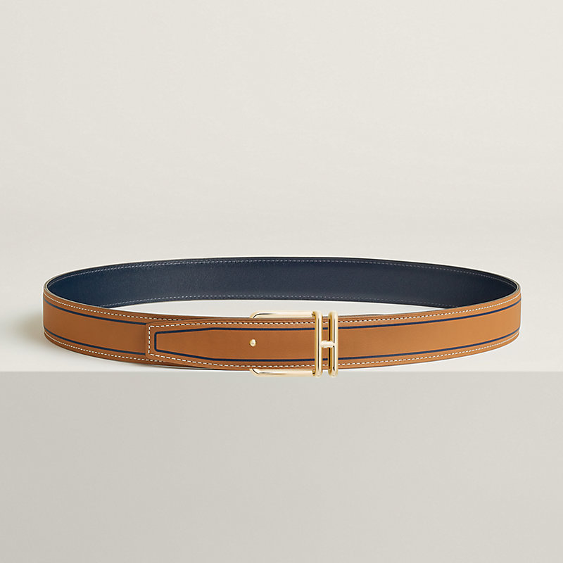 双面金属皮带扣。Volte-face皮带扣推出两种款式:正装风格款式展现传统的预组装美学,休闲风格款式具有Nathan系列的特色。 & 印花Swift和Box 135小牛皮双面皮腰带。Contrast 32皮腰带采用1930年代爱马仕海报上使用的字体,营造出装饰艺术氛围。条纹中央低调地呈现“Hermès Paris”字样。